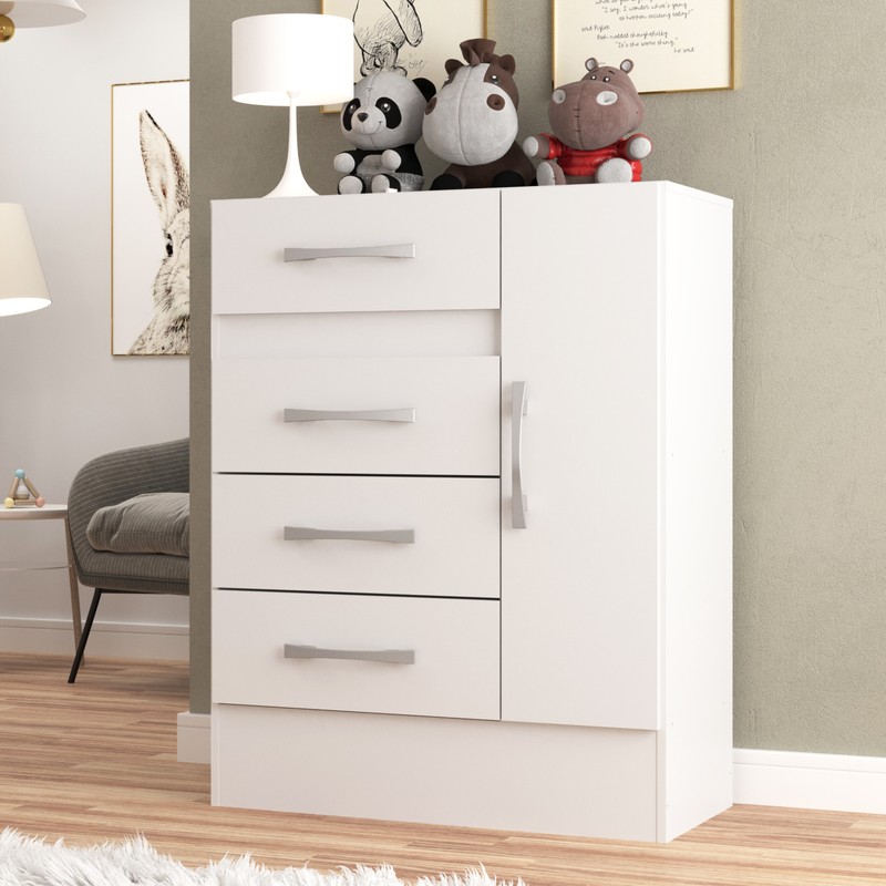 A Cômoda 4 gavetas e uma porta Jasmine tem a Ideia de proporcionar versatilidade e alinhar a organização do seu espaço. Confeccionada 100% em MDP a Cômoda possui um design moderno e tras a praticidade e espaço perfeito para você organizar suas roupas e acessórios. Ela também pode ser o seu Multiuso Ideal.