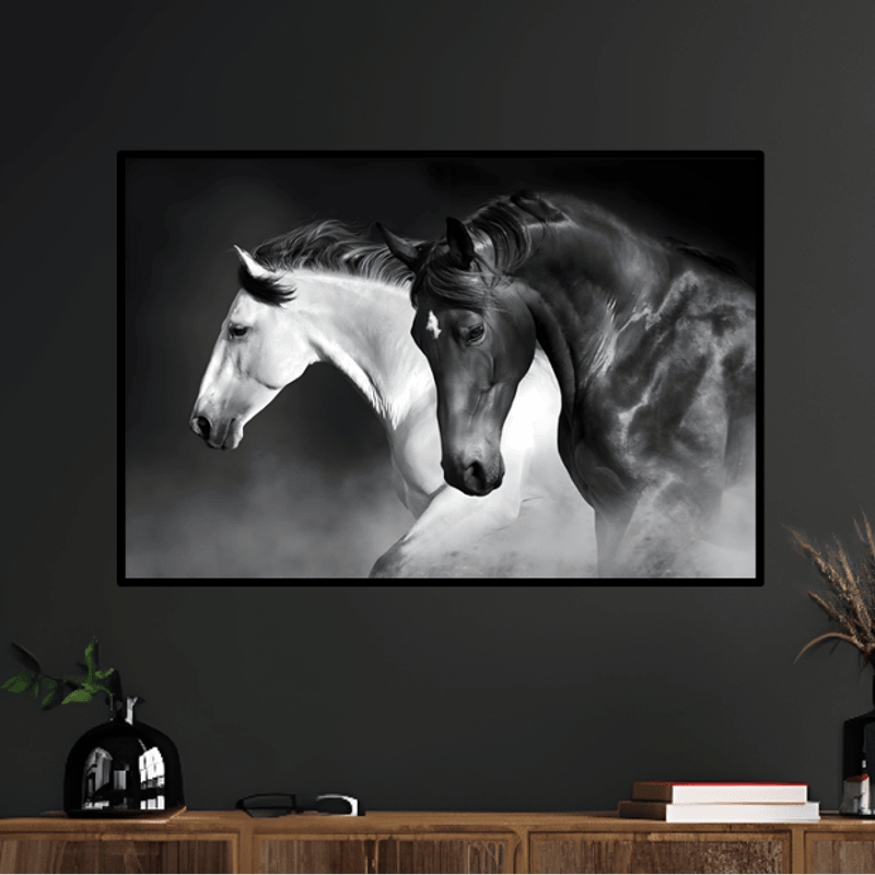 Quadro Decorativo Cavalos Preto Branco 70x50